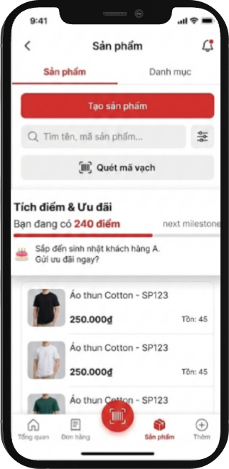 Lưu thông tin khách quen. Dễ dàng cài đặt tích điểm đổi quà, tạo combo (VD:mua 1 thùng tặng 1 lốc). Gửi tin nhắn khuyến mãi Zalo để khách quay lại.